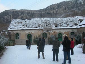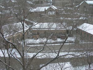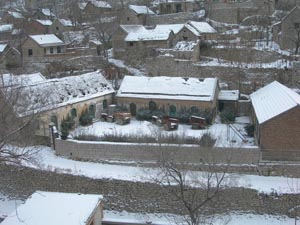 村里居然有一個(gè)文革時(shí)期留下的頗為現(xiàn)代的立交橋,依山傍勢,建造別致,載重的車輛、牛馬車可從橋下通過。自橋上逶迤走過去,便是那座已然廢棄的小學(xué)校,銹跡斑斑的圓拱鐵門,長方形的積雪的小院子,四五間教室,門框上還刻著“忠”字,一切都像回到過去的時(shí)光。小山村整體不大,幾十戶人家,但很有立體感,層次分明,像是江南的一個(gè)小村子不小心落在北方,房頂上覆滿雪,以及遠(yuǎn)山的薄雪,一時(shí)又飄起雪來,寂靜無聲,讓我們這些從喧囂的鬧市中來的人頓有與世隔絕之感。