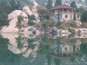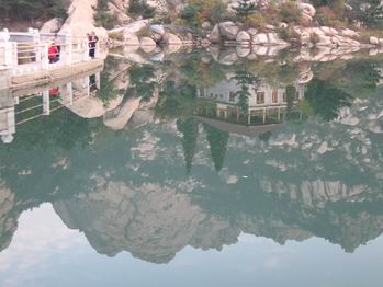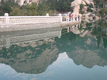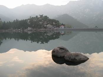 二龍山的石頭非常有特色,與浮山的石頭氣勢(shì)截然不同。如果說浮山的山石是桀驁不馴的藝術(shù)家,那么二龍山的石頭就是粗重大氣的山東大漢。遠(yuǎn)遠(yuǎn)近近、層層疊疊的山峰似無數(shù)張?zhí)鴦?dòng)的心電圖重疊在一起,一個(gè)波峰接一個(gè)波峰,深深淺淺的色彩似隨意灑脫的潑墨山水。山腳一個(gè)大壩,上游不經(jīng)意流下來的細(xì)細(xì)水流,到這里竟然匯聚成一汪碧綠的深潭,碧波蕩漾溫柔恬靜如二八少女,更反襯出山巒的雄偉蒼翠。